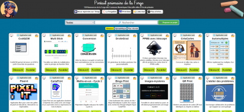 Apps Education vous donne également accès à la Forge. La Forge est une plateforme collaborative de ressources libres et gratuites créées par des enseignants. Depuis la page d'accueil, en cliquant sur "ressources" puis en sélectionannt "primaire", vous arrivez sur la page des applications dédiées au primaire.